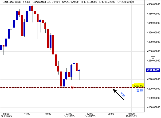 黄金价格经过上周五超过$190美元大幅度上下波动之后,应该有力在$4,200美元水平找到支持。因为上星期五的先大幅度上升后急速下挫的势头,应该已经消化掉累积了一段时间屡创新高后的大部份获利回吐沽压。现时市场焦点,仍然落在联储局在下星期的议息会议上有减息的寄望,故此,趁低吸纳黄金的动作有望金价在短线回落至$4,203美元附近进场。