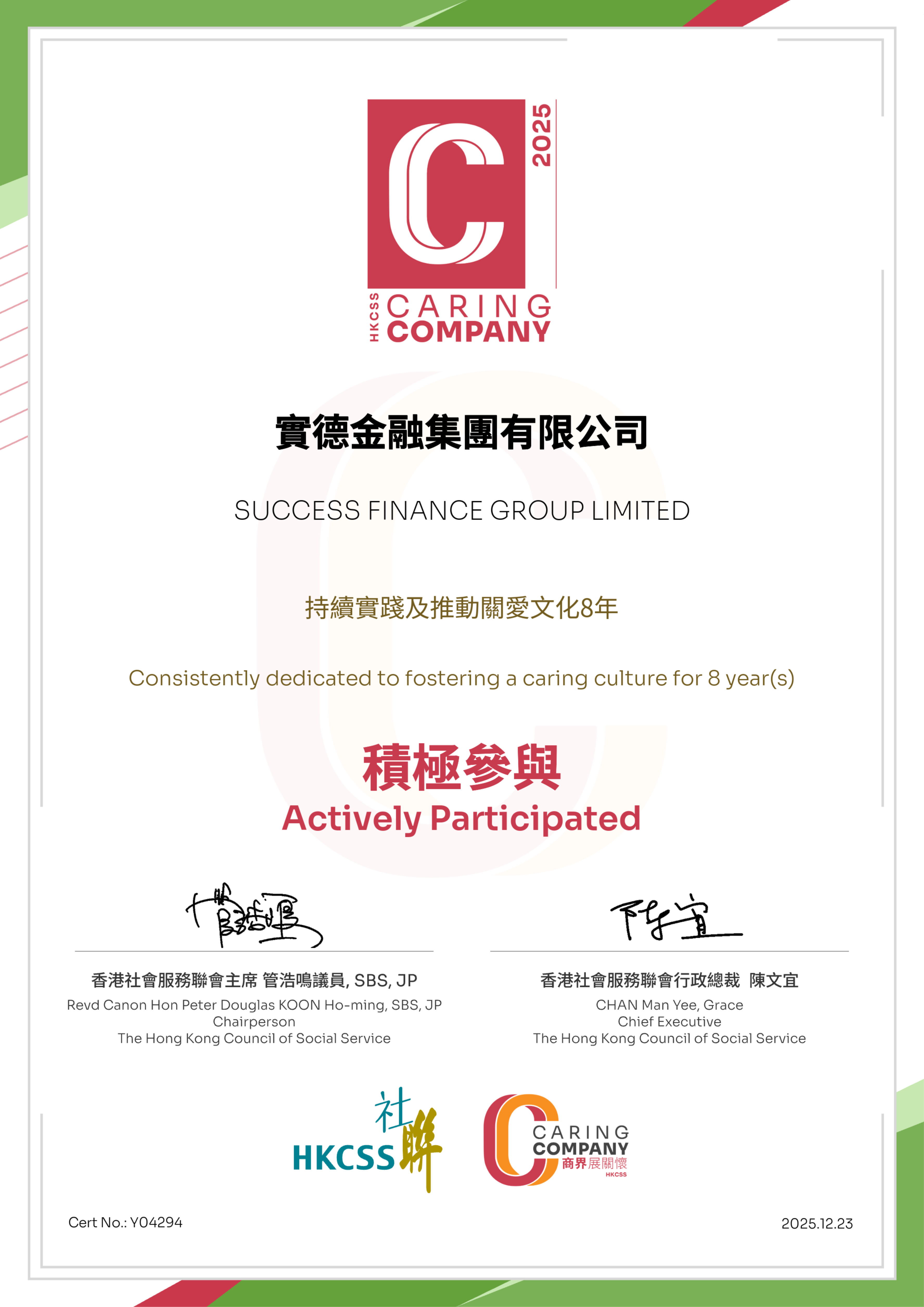 實德金融集團(下稱「實德金融」或「本公司」)始終積極履行企業社會責任,致力回饋社會。今年再度獲香港社區服務聯會頒發「商界展關懷」嘉許標誌,並為實德金融連續第八年獲此嘉許,充分肯定本公司在促進員工福祉、關懷社會及環境保護方面的長期貢獻。