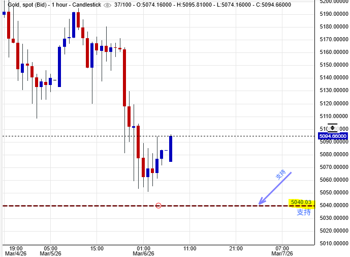 随着市场人士并不肯定美国及以色列对伊朗的军事袭击行动,能否在数星期之内完全结束,持有美元为主要策略的展望暂时应该不会逆转过来,这美元上升的因素应该会打压着金价的回升走势,与此同时,这场美国、以色列及伊朗的战争有机会刺激油价持续上升,而严峻地影响着联储局的减息进程,利率去向因素短期间亦会拖累金价的走势,金价短线有机会需要先反复下试$5,040美元的支撑力,才能够打稳阵脚下来。