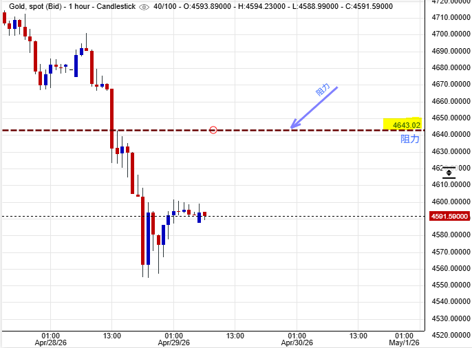 可以部署在$4,643美元左右建立淡倉盤,短線看淡金價一線至$4,534美元水平後止賺,止損在$4,663美元。